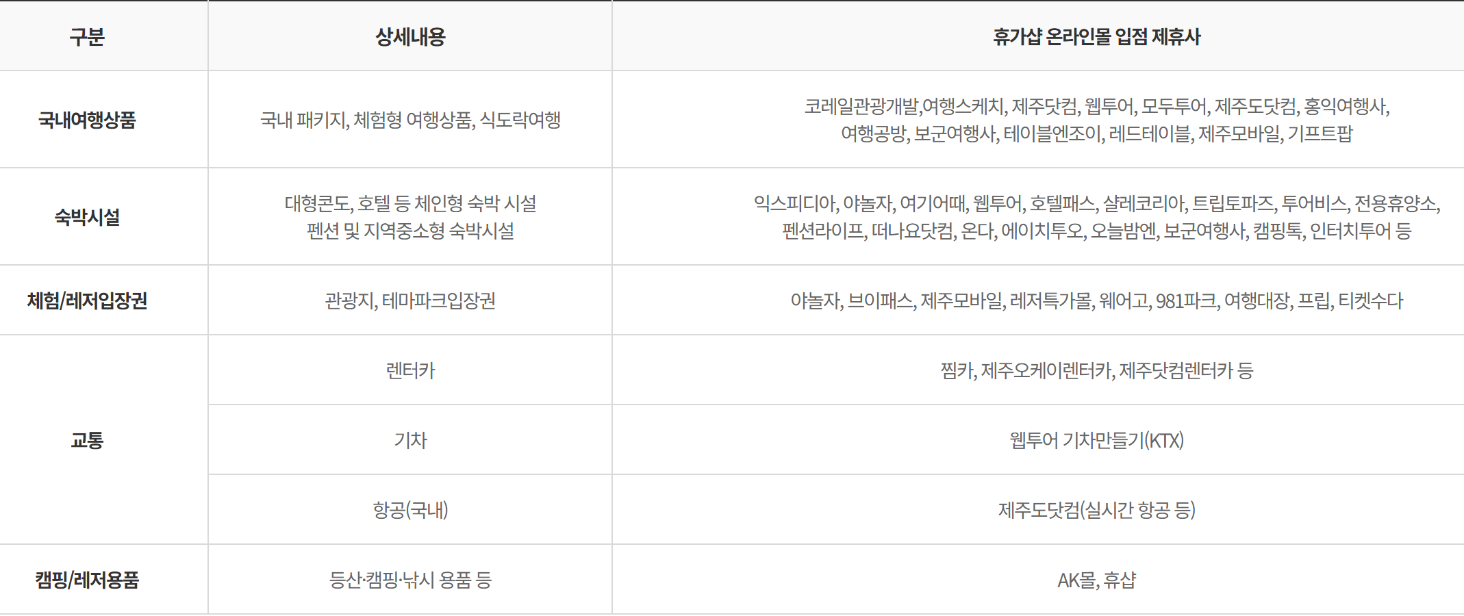 위와 같은 방법으로 40만 원의 포인트를 받으면 '휴가샵'이라는 홈페이지나 스마트폰 앱으로 여행과 관련된 상품을 구입하는 사용할 수 있습니다. 숙박시설 예약이나, 관광지, 테마파크 입장권 구매, 전시화나 공연예약, 교통편 예약을 비롯하여 레저용품 구매나 책을 구매하는데 까지 다양하게 사용가능합니다.