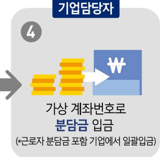 3) 기업담당자는 참여근로자의 세부정보를 입력하고 가상계좌로 기업 10만 원, 근로자 20만 원의 분담금을 일괄 입금
