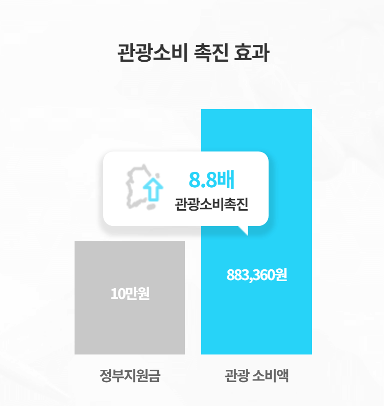 근로자 휴가지원사업은 관광소비를 촉진시키고 관광참여를 확대시키는 효과가 있습니다. 10만 원의 정부지원금으로 약 10배 이상의 관광소비를 촉진시키고, 근로자에게는 국내여행에 대한 관심을 높이고 또한 지원금도 받을 수 있는 정부지원제도이니 관심 있으신 분들은 혜택을 이용하여 보시기 바랍니다.