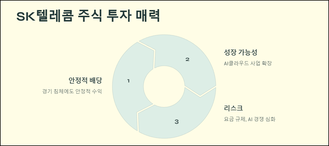 SK텔레콤은 안정적인 배당과 AI·클라우드 사업 성장 가능성을 고려했을 때 매력적인 투자처 중 하나입니다. 특히, 통신업 특성상 경기 침체에도 비교적 안정적인 수익 구조를 유지할 수 있다는 점이 강점이죠. 다만, 통신 요금 규제와 AI 경쟁 심화 등 리스크도 존재하므로 신중한 투자 전략이 필요합니다.