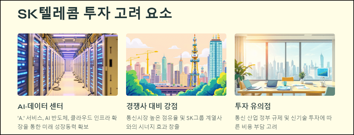 단순히 실적과 배당만을 보고 투자할 수는 없습니다. SK텔레콤의 사업 방향, 리스크 요인, 경쟁사와의 차별성까지 종합적으로 고려해야 합니다.